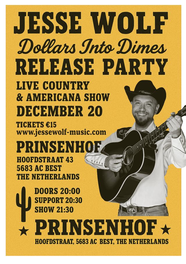 Op 20 december 2025 verschijnt het debuutalbum Dollars into Dimes op LP! Dat viert Jesse Wolf met een Country & Americana-avond vol topmuzikanten, kwaliteit en vakmanschap.