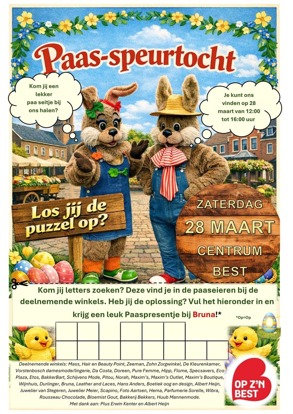 Kom jij de letters zoeken van onze speurtocht? Deze vind je in de paaseieren bij de deelnemende winkels. Heb jij de oplossing? Vul het hieronder in en krijg een leuk Paaspresentje bij Bruna! Je kunt ons vinden op 28 maart van 12:00 tot 16:00 uur