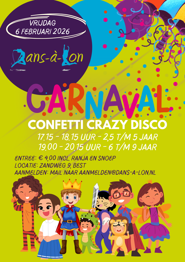 Op vrijdag 6 februari verandert Dans-à-Lon in één groot feest tijdens onze vrolijke Carnavalsdisco voor kinderen. Een middag vol muziek, dans, spelletjes en natuurlijk héél veel confetti!