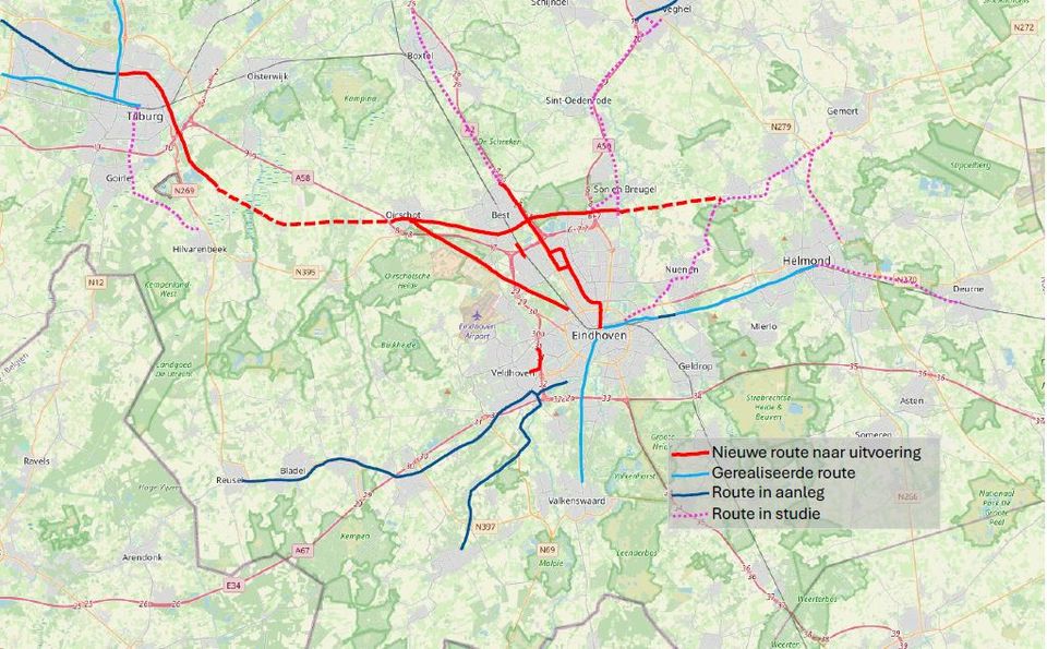Deze zomer zetten de provincie en alle tien betrokken gemeenten hun handtekening onder de bestuursovereenkomsten die moeten leiden tot de aanleg van de vijf routes. Dat zijn Eindhoven, Veldhoven, Best, Oirschot, Son en Breugel, Laarbeek, Nuenen, Tilburg, Oisterwijk en Hilvarenbeek. Op de eerste locatie is zelfs al de schop de grond in gegaan. In de loop van volgend jaar moet de aanleg van alle nieuwe routes beginnen.